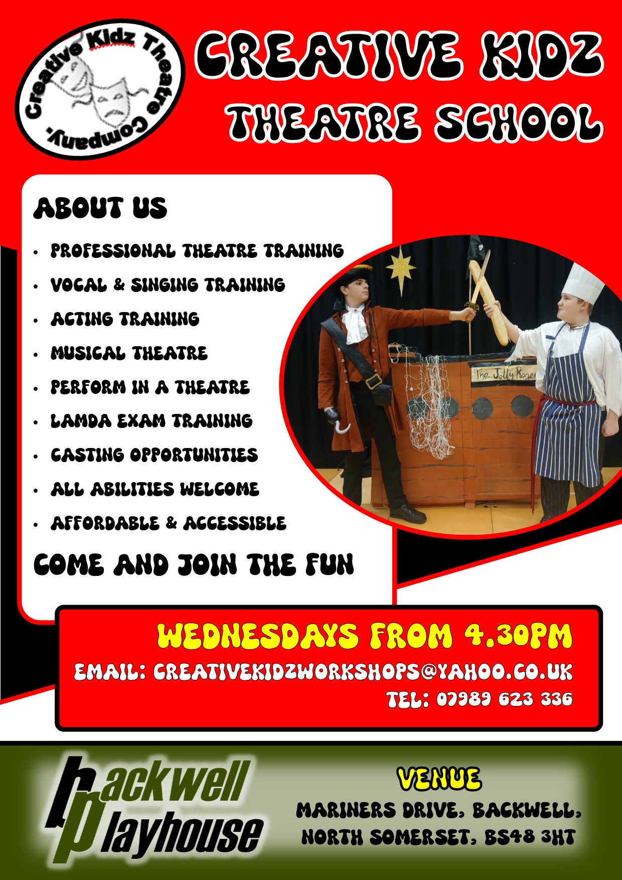 Classes at the PlayhouseThe Playhouse is host to some independant groups who use the theatre as a place to hold their classes on a weekly basis. ![]() Creative Kidz Theatre CompanyCreative Kidz rehearse at Backwell Playhouse on Wednesday afternoons from 4.30pm for young people of all abilities. If your young person is interested in taking part, please email CreativeKidzWorkshops@Yahoo.co.uk or call 07989 623 336 | ||||||