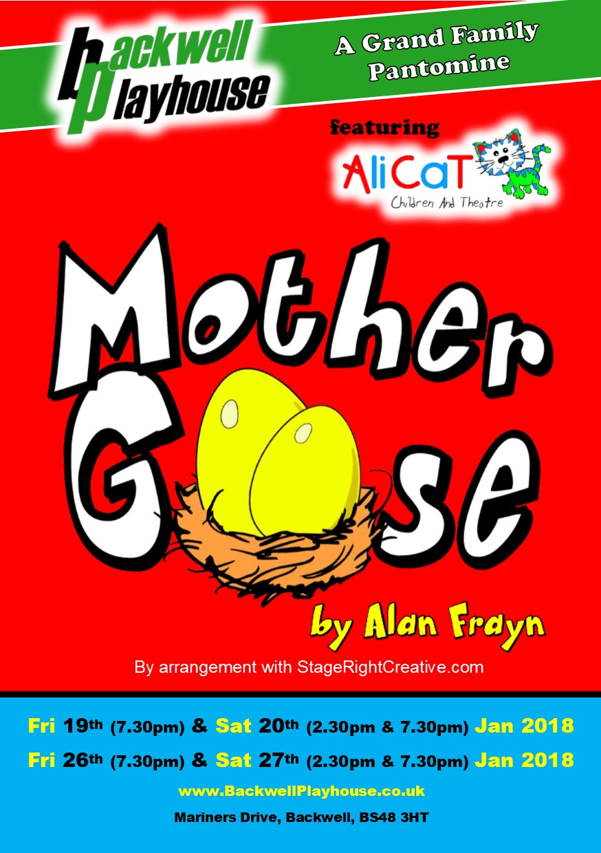 | The Playhouse Theatre Company presents | Mother Goose | Friday 19 Jan 2018 - Saturday 20 Jan 2018 | Performance Time: 19:30 (Saturday Matinee: 14:30) | Box Office: Box Office: Alan & Ruth: 01275 462621; John: 0117 963 3586; Due to popular demand, matinee tickets are only available from John via phone | Tickets: £12 (£9 Members/Children) | An Eggs-travaganza of a Pantomime!
