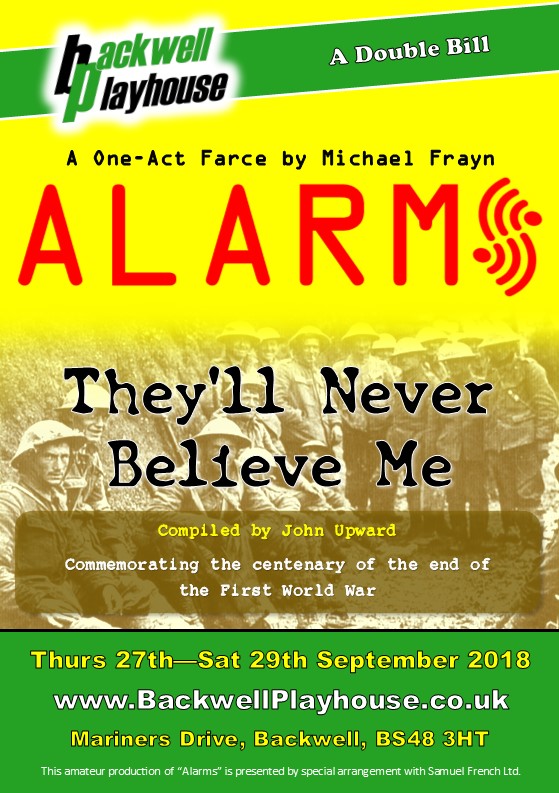 .jpg) | The Playhouse Theatre Company presents | Alarms / They’ll Never Believe Me | Thursday 27 Sep 2018 - Saturday 29 Sep 2018 | Performance Time: 20:00 | Box Office: John 0117 963 3586; Jon 0797 422 3081