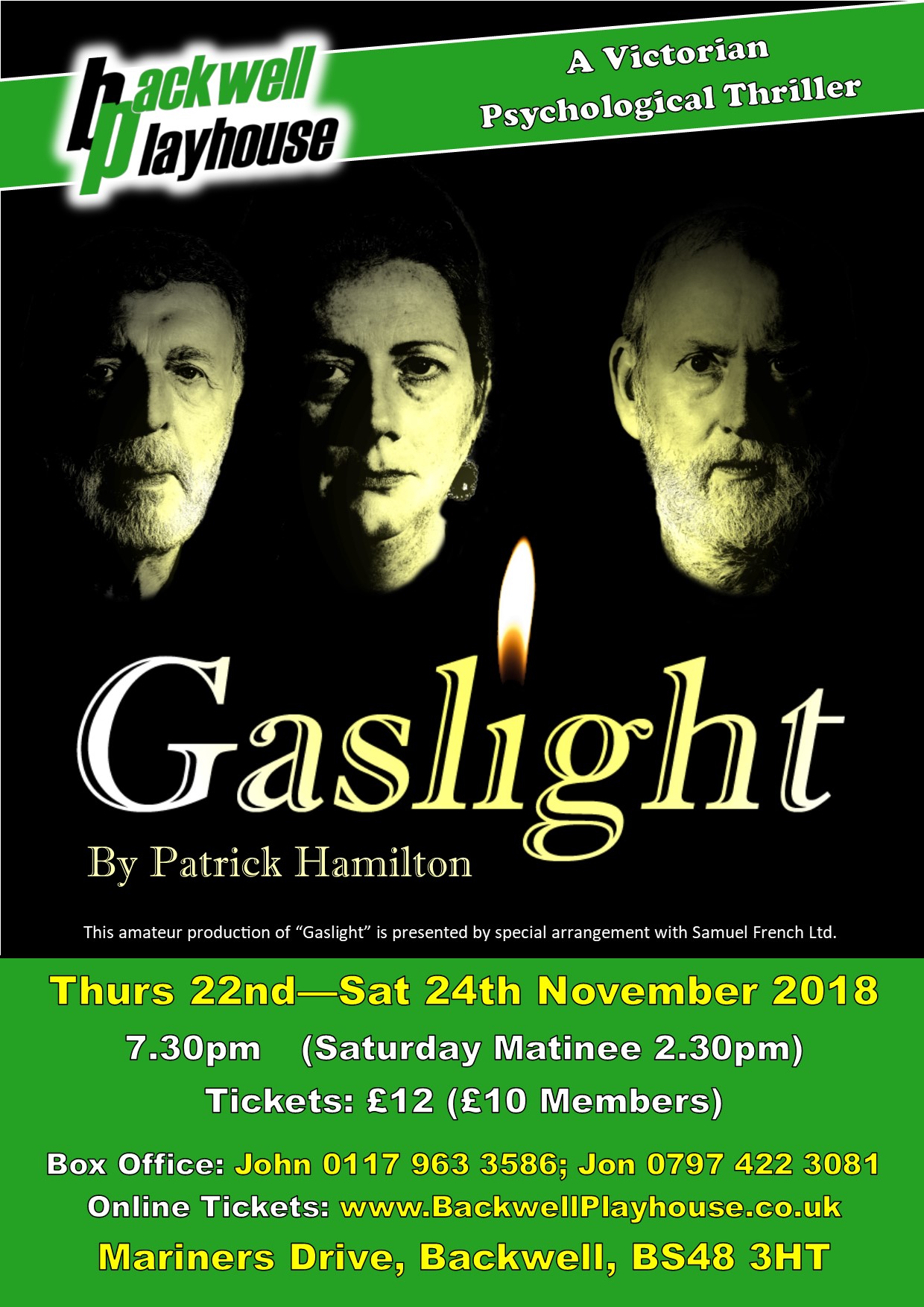 | The Playhouse Theatre Company presents | Gaslight | Thursday 22 Nov 2018 - Saturday 24 Nov 2018 | Performance Time: 19:30 (Saturday Matinee: 14:30) | Box Office: John 0117 963 3586; Jon 0797 422 3081