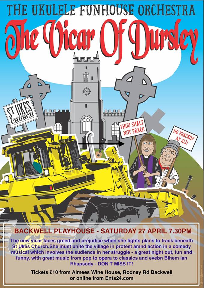 | Ukulele Funhouse Orchestra presents | The Vicar of Dursley | Saturday 27 Apr 2019 | Performance Time: 19:30 | Box Office: Available from Aimee’s Winehouse or online from Ents24.com | Tickets: £10 | | The new vicar faces greed and prejudice when she fights plans to frack beneath St Ukes Church. She must unite the village in protest and action in a comedy musical which involves the audience in her struggle. A great night out, fun and funny, with great music from pop and opera to classics, and even Bohemian Rhapsody – DON’T MISS IT! | |