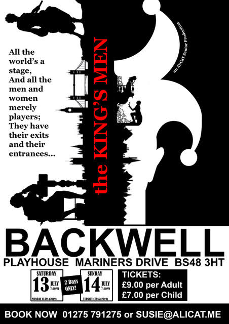 | AliCaT Children and Theatre presents | The King’s Men | Saturday 13 Jul 2019 - Sunday 14 Jul 2019 | Performance Time: 19:30 | Box Office: Susie: 01275 791275 or email susie@alicat.me | Tickets: £9 (£7 Children) | A story about theatre. It follows a troupe of actors ’The King’s Men’through the ages. We discover how theatre has evolved from Primitive theatre to Renaissance and how we see the modern theatre of today... come along to learn the influences, the cultures and the changes in different countries that have evolved over the decades... | |
