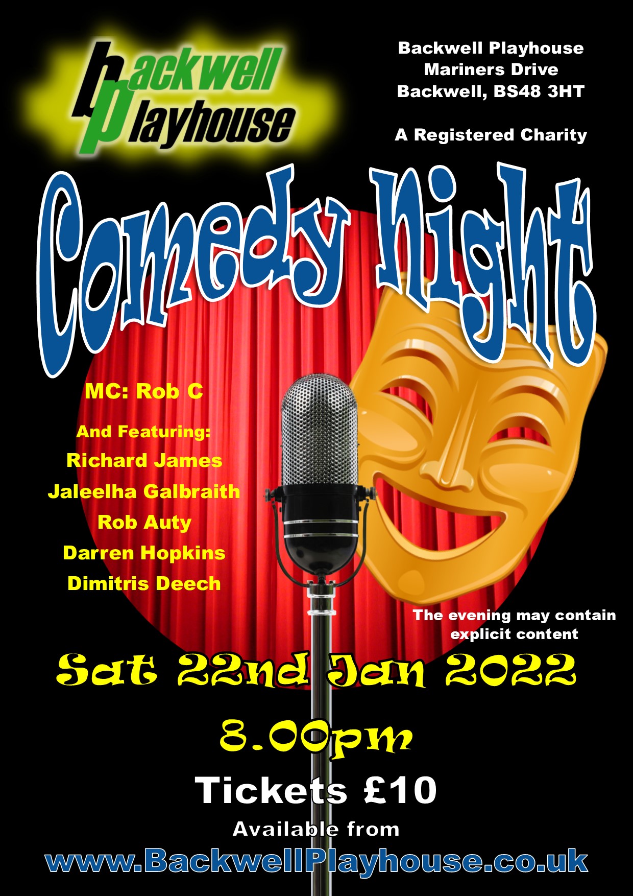 | The Playhouse presents | Comedy Night | Saturday 22 Jan 2022 | Performance Time: 20:00 | Box Office: Tickets available from our shop: Backwell Playhouse Ticket Shop | Tickets: £10 | | Backwell Playhouse are delighted to host a Comedy Night. We welcome back to Rob C as our MC for the night. Our performers for the evening are: Richard James, Jaleelha Galbraith, Rob Auty, Darren Hopkins, Dimitris Deech | |