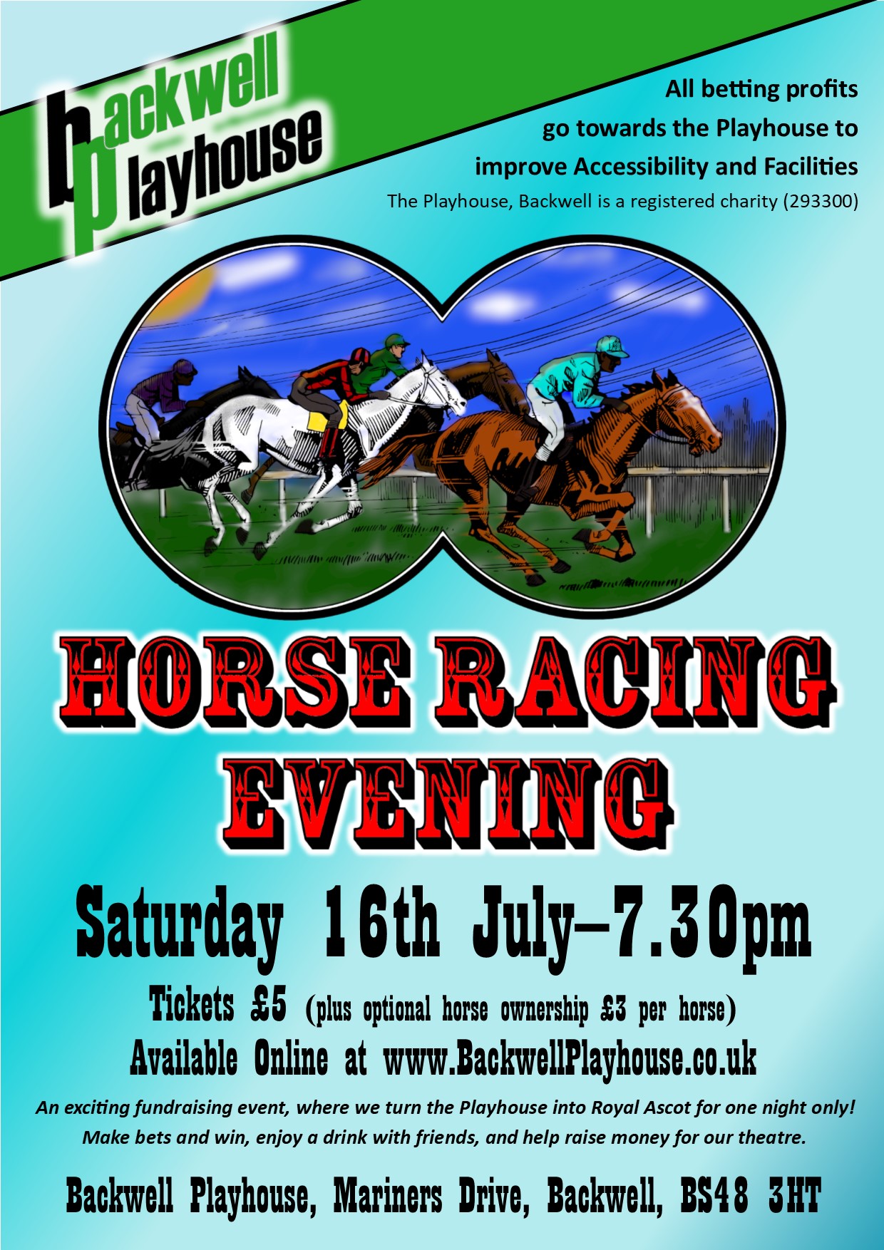 | The Playhouse presents | Horse Racing Evening CANCELLED | Saturday 16 Jul 2022 | Performance Time: Doors open: 19:00, first race 19:45 | Box Office: Tickets available from our shop: Backwell Playhouse Ticket Shop or by calling Jon on 07974223081 to pay by card | Tickets: £5 (Optional £3 horse ownership also available) | CANCELLED We have made the decision to cancel our Horse Racing Evening. We hope to reschedule it for later in the year.