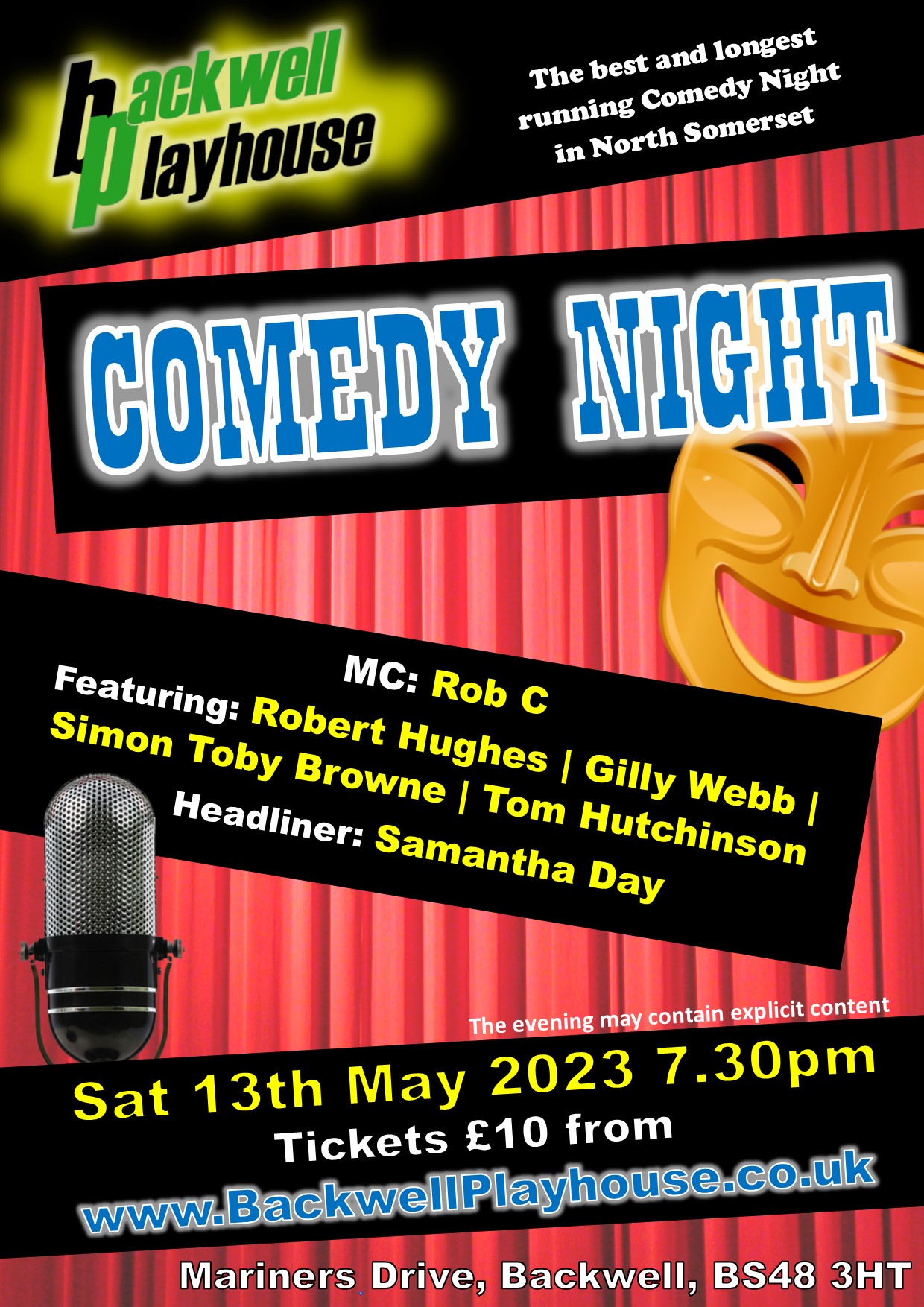 | The Playhouse presents | Comedy Night | Saturday 13 May 2023 | Performance Time: 19:30 | Box Office: Tickets available from our shop: Backwell Playhouse Ticket Shop | Tickets: £10 | After the near sell-out of our January evening, we are delighted to announce our next Comedy Night on Saturday 13th May. Our MC for the night is Rob C, who is joined by: Robert Hughes, Gilly Webb, Simon Toby Browne, Tom Hutchinson, and our Headliner: Samantha Day.
