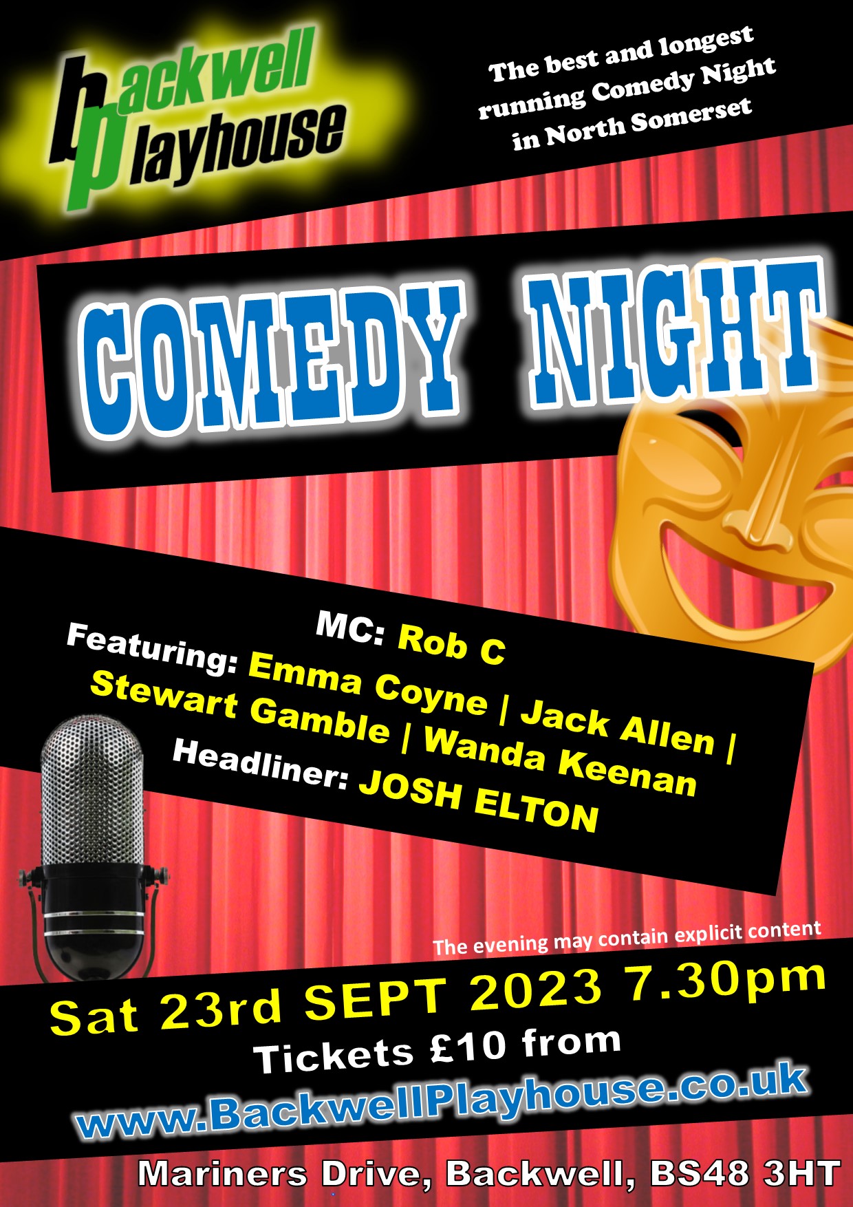 | The Playhouse presents | Comedy Night | Saturday 23 Sep 2023 | Performance Time: 19:30 | Box Office: Tickets available from our shop: Backwell Playhouse Ticket Shop | Tickets: £10 | Our MC for the night is Rob C, who is joined by: Emma Coyne, Jack Allen, Stewart Gamble, Wanda Keenan and our Headliner: Josh Elton.