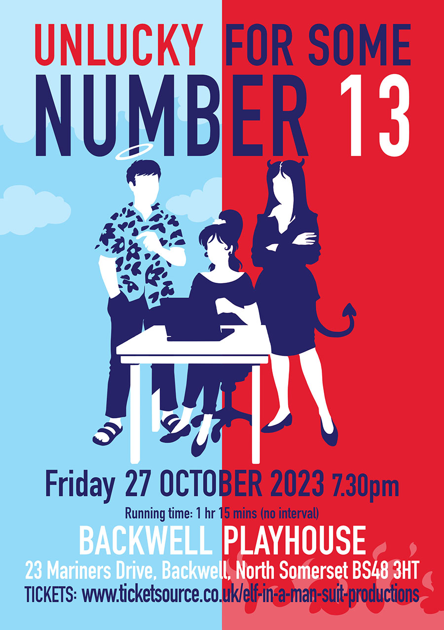 | Elf In A Man Suit Productions presents | Unlucky For Some, Number 13 | Friday 27 Oct 2023 | Performance Time: 19:30 | Box Office: Online tickets: Ticket Source | Tickets: £12 (£10.50; Under 18s) | Following amazing audience reviews from the SOLD OUT Bristol run of Unlucky For Some, Number 13, Elf In A Man Suit Productions bring this moving, funny and off-the-wall one act comedy to the Backwell Playhouse for one night only.