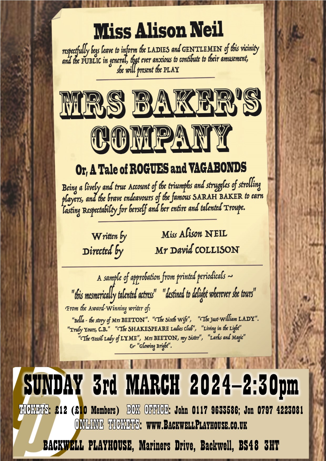 | The Playhouse Theatre Company and Alison Neil presents | Mrs Baker’s Company or, A Tale of Rogues and Vagabonds | Sunday 03 Mar 2024 | Performance Time: Sunday Matinee 14:30 | Box Office: John 0117 963 3586; Jon 0797 422 3081