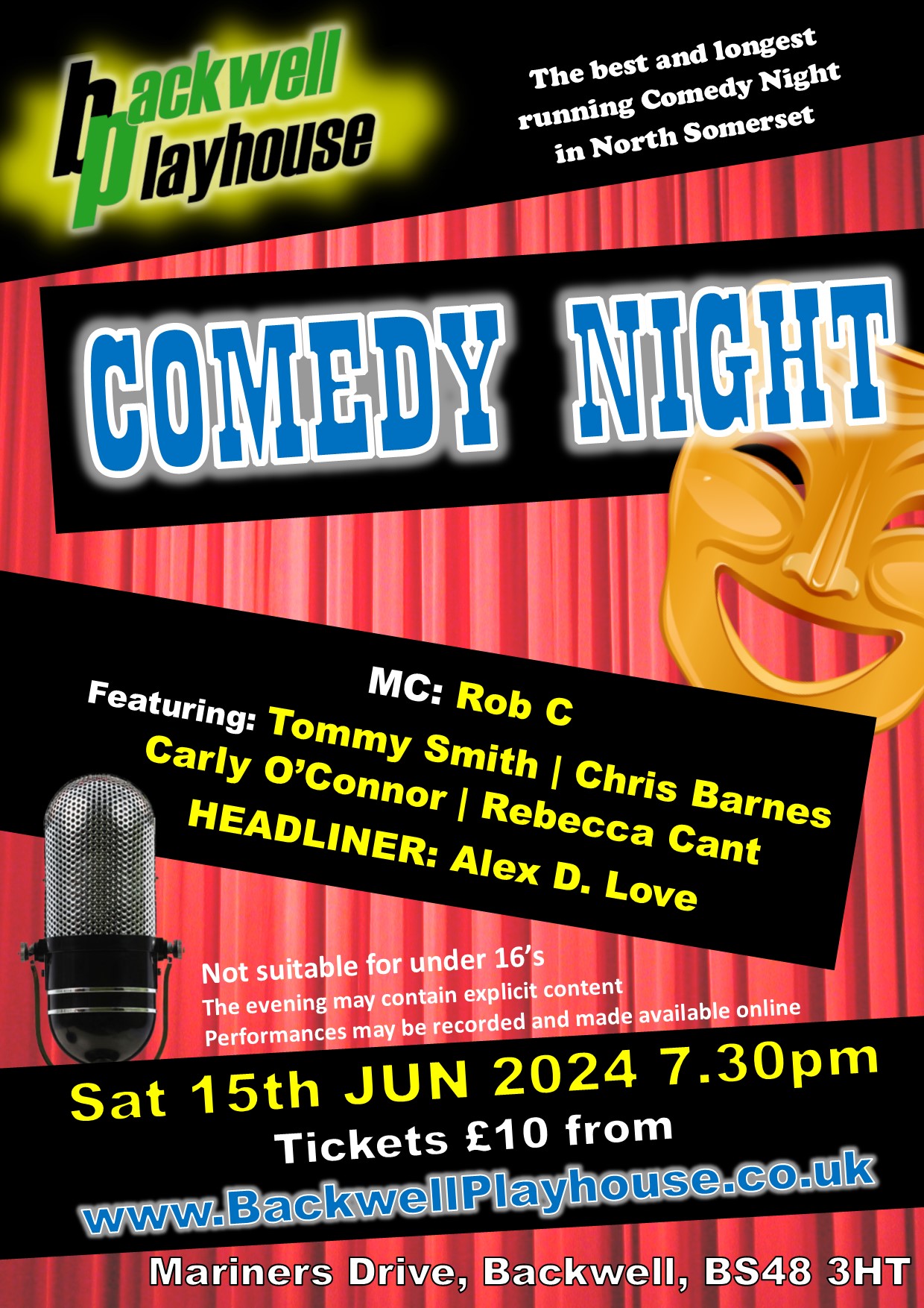If you would like to reserve tickets to pay on the door, please email details to: mailinglist@backwellplayhouse.co.uk or call Jon on 0797 422 3081. | Tickets: £10 | Join Backwell Playhouse for North Somerset’s longest and best Comedy Night. Our MC for the night is Rob C, who is joined by: Tommy Smith, Chris Barnes, Carly O’Connor and Rebecca Cant. The Headliner is Alex D. Love