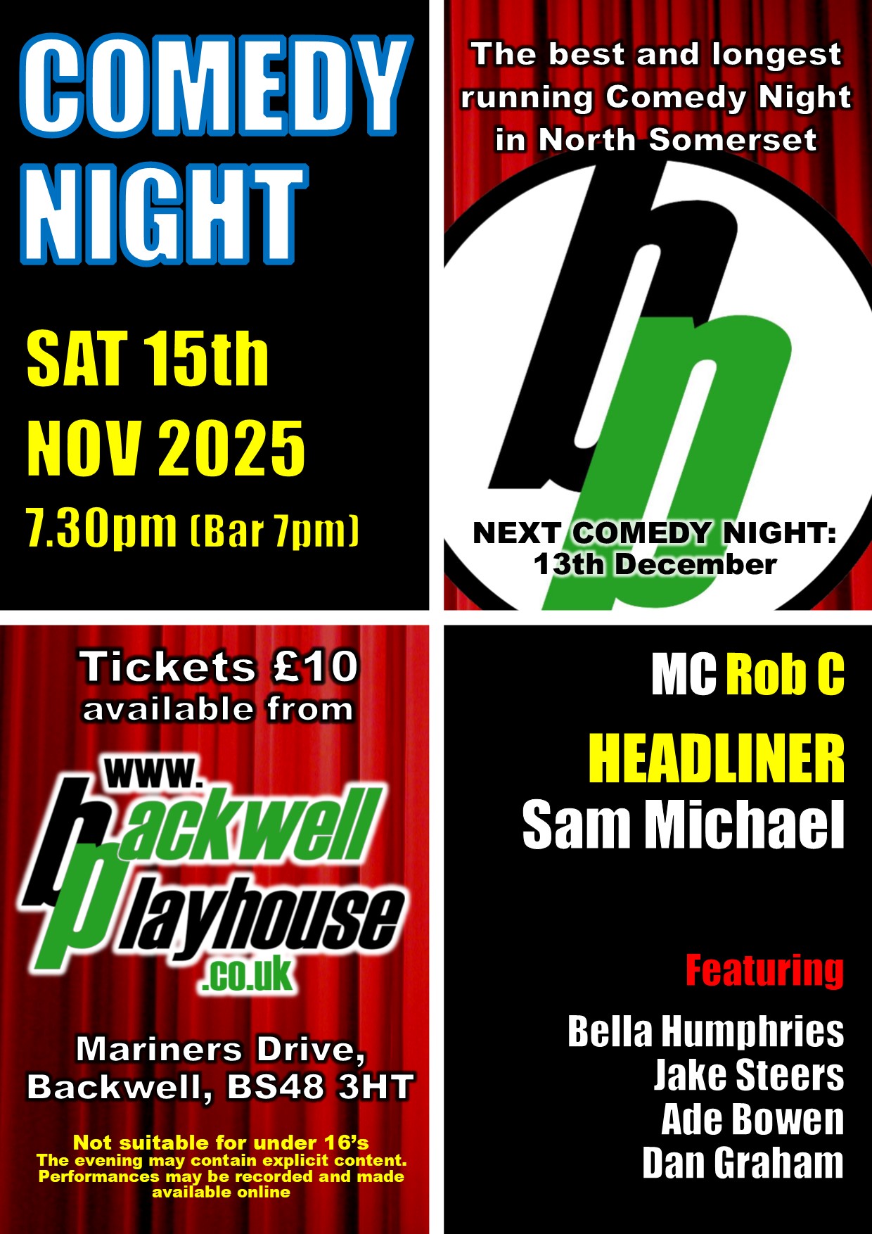 | The Playhouse presents | Comedy Night | Saturday 15 Nov 2025 | Performance Time: 19:30 | Box Office: Tickets available from our shop: Backwell Playhouse Ticket Shop