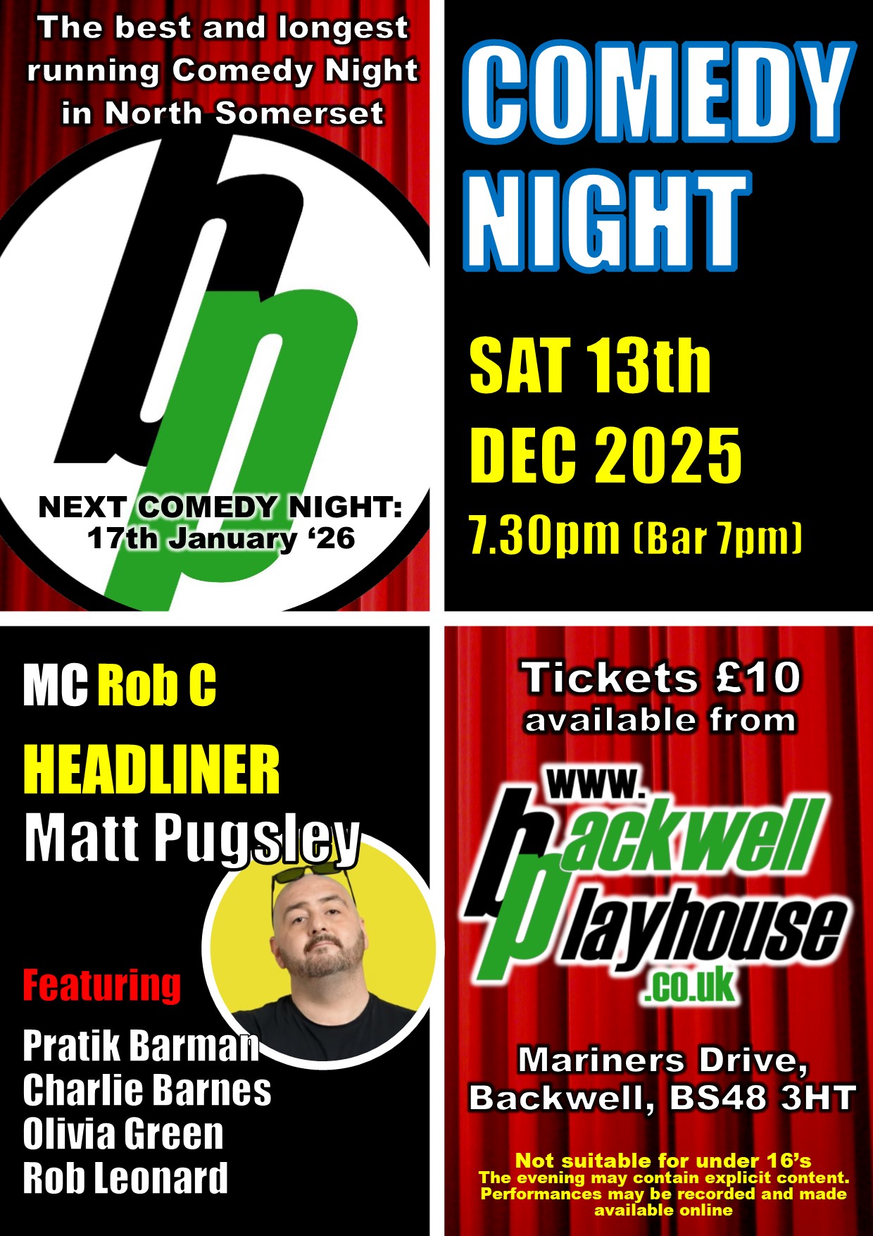 | The Playhouse presents | Comedy Night | Saturday 13 Dec 2025 | Performance Time: 19:30 | Box Office: Tickets available from our shop: Backwell Playhouse Ticket Shop