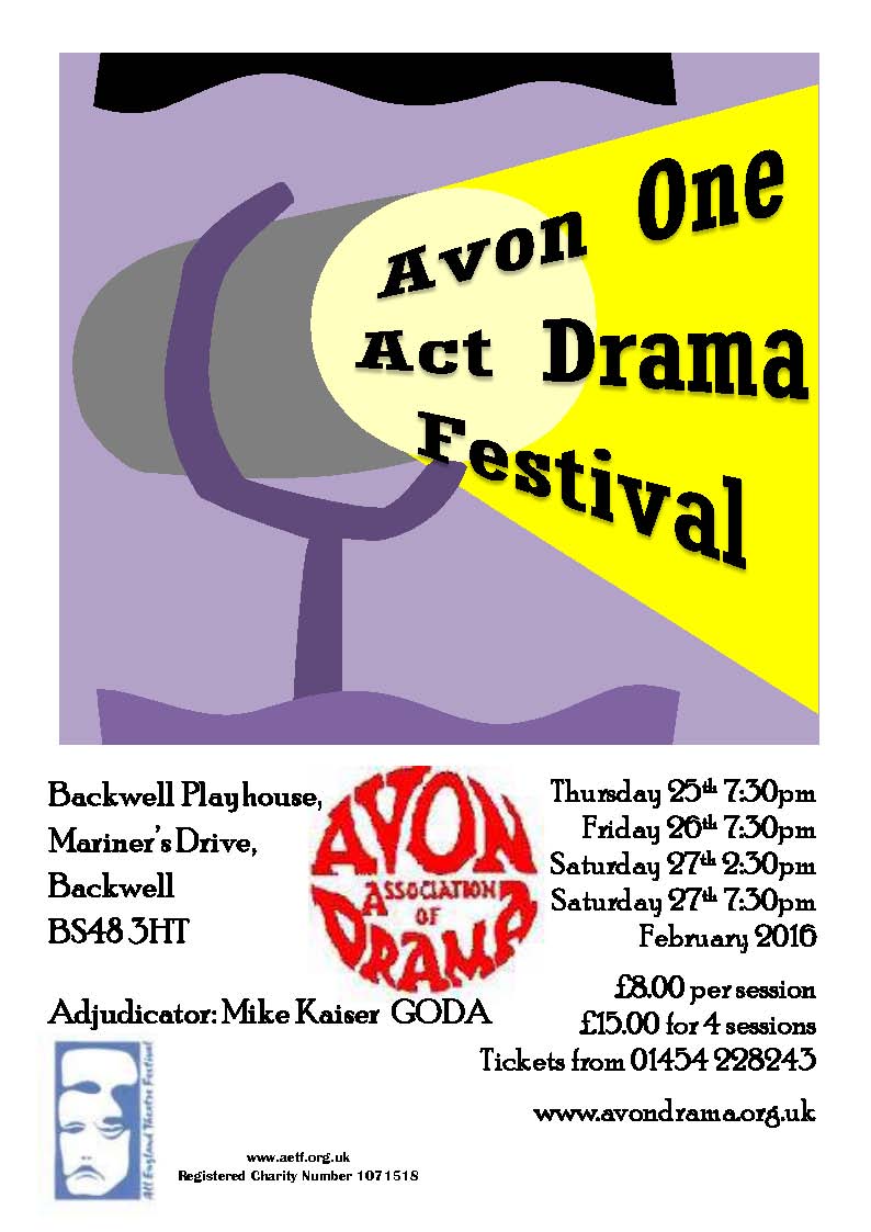 | Avon Association of Drama presents | Avon One Act Play Festival | Thursday 25 Feb 2016 - Saturday 27 Feb 2016 | Performance Time: Thursday 19:30 Friday 19:30 Saturday 14:30 and 19:30 Different plays each time | Box Office: tba | Tickets: £8.00 per session All four sessions for just £15.00 | Thursday 25th February at 19:30 SPP Theatre Company: The Arrangement by Toby Rome St Alban’s Players: Interior Designs by Jimmie Chinn The Oldland Players: Blackadder II – “Bells” by Richard Curtis and Ben Elton The plays this evening may have adult content/language
