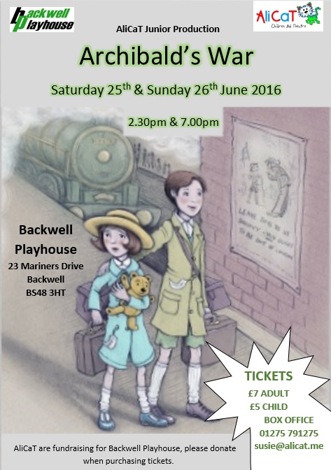 | Alicat presents | Archibald’s War | Saturday 25 Jun 2016 - Sunday 26 Jun 2016 | Performance Time: v | Box Office: Susie: 01275 791275 or email susie@alicat.me | Tickets: £7 Adults and £5 Children | | The hugely popular AliCaT Theatre Group present their Junior class’ end-of-year show, "Archibald’s War" | |