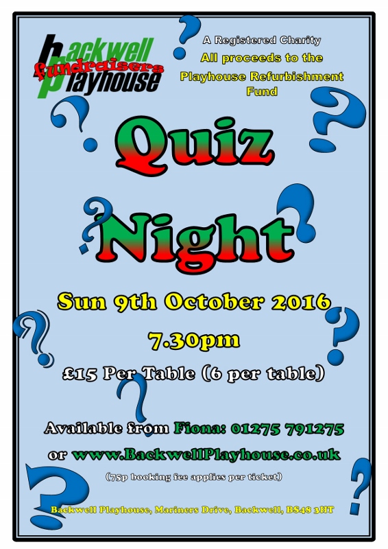 | Backwell Playhouse Fundraisers presents | Playhouse Quiz Night | Sunday 09 Oct 2016 | Performance Time: