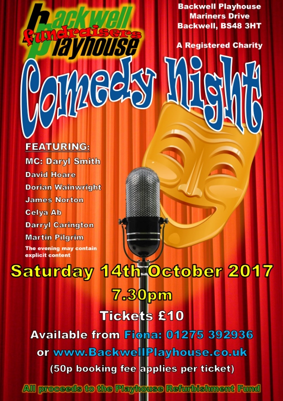 | Backwell Playhouse Fundraisers presents | Comedy Night | Saturday 14 Oct 2017 | Performance Time: 19:30 | Box Office: Fiona: 01275 392936